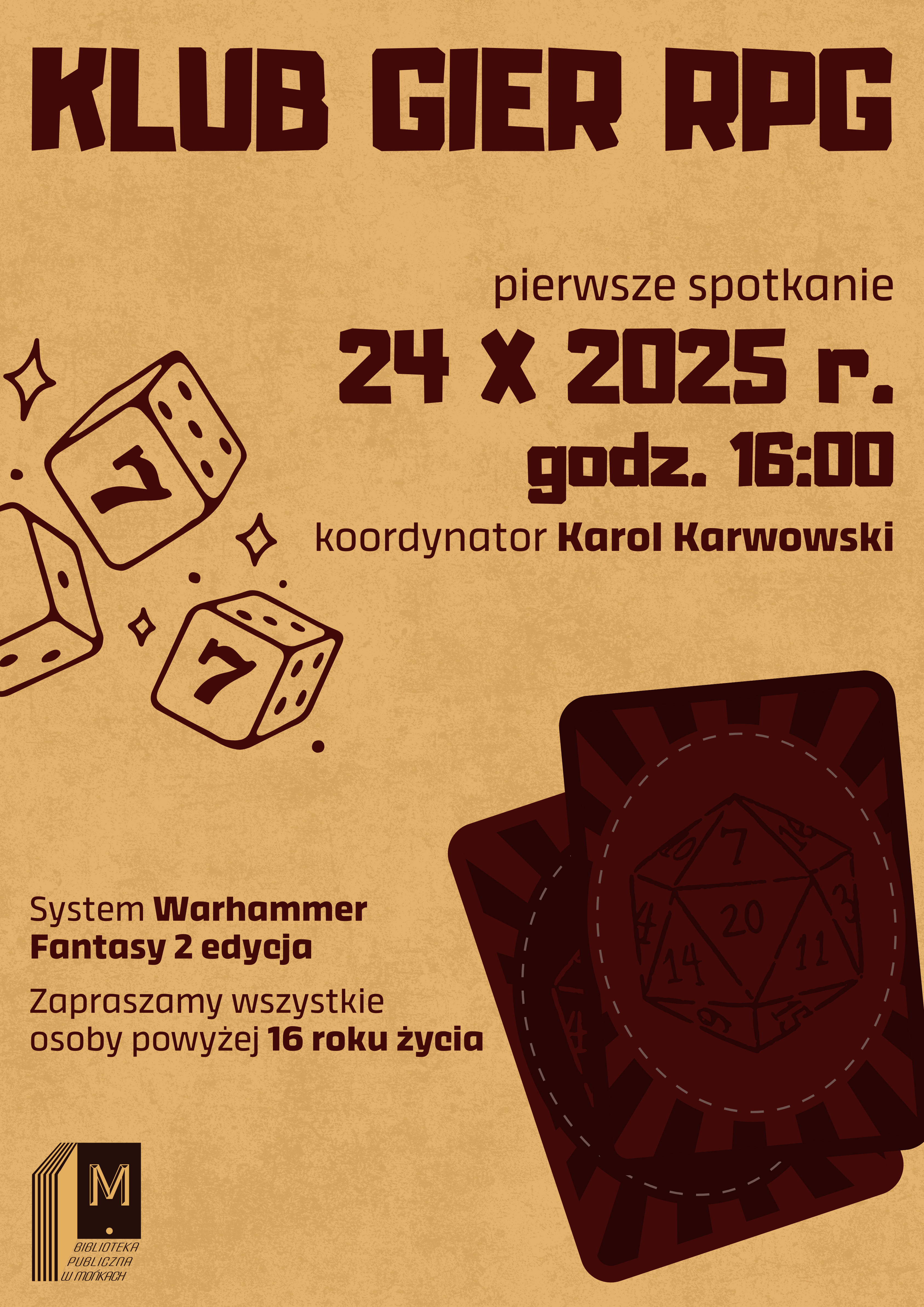 Lubisz fantastykę, przygody i dobrą zabawę w gronie pasjonatów? Dołącz do nowo powstałego Klubu Gier RPG w Mediatece w Mońkach! Na naszym pierwszym spotkaniu ruszamy