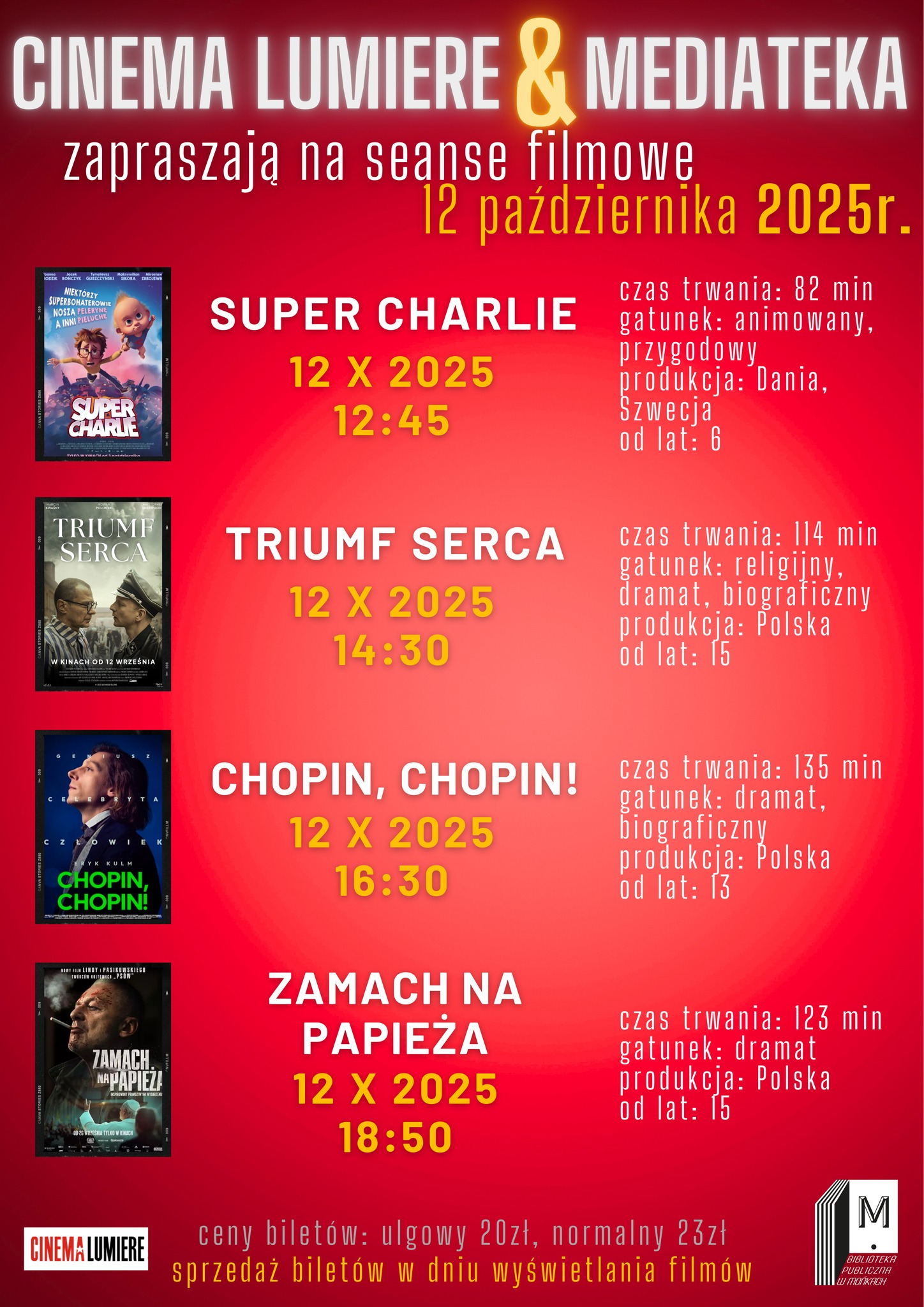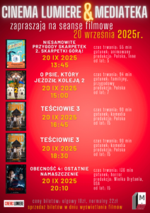 Mediateka i Cinema Lumiere Prezentuje zapraszają na biletowane seanse filmowe w MEDIATECE, które odbędą się 20 września 2025 (sobota) NIE OBOWIĄZUJE rezerwacja miejsc, zakup biletów