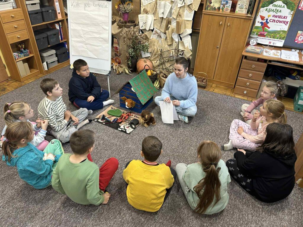 Dzieci wysłuchały bajki edukacyjnej pt. „Smutasek”, której bohaterem był bezdomny piesek. Podczas słuchania uczniowie starali się wczuć w emocje i sytuację zwierzątka, a następnie chętnie dzielili się swoimi refleksjami i spostrzeżeniami. Wspólnie zastanawiali się nad znaczeniem słów „bezdomny” i „samotny”, a także próbowali znaleźć sposoby rozwiązania problemu bezdomnych psów.