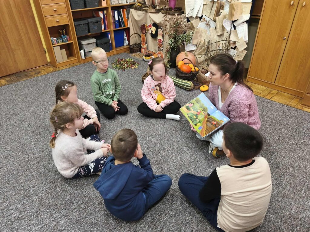 Po krótkim zwiedzaniu przenieśliśmy się do czytelni, gdzie wspólnie czytaliśmy opowieści o jesieni, a następnie dzieci wzięły udział w zabawach i wyzwaniach przygotowanych przez panią bibliotekarkę. Nie zabrakło zagadek, zadań związanych ze zbieraniem kasztanów, a nawet konkurencji polegającej na utrzymaniu kasztana na nosie!