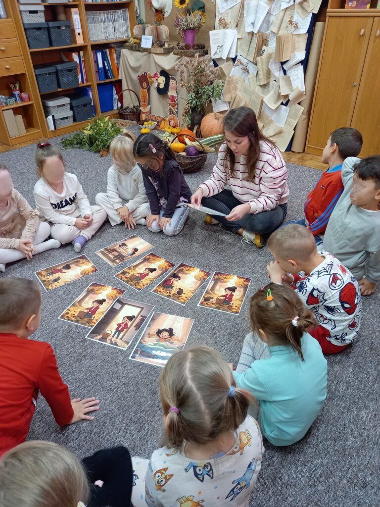 Na miejscu wysłuchały jesiennego opowiadania o dziewczynce, jeżyku i kasztanach, a następnie – na podstawie wysłuchanego tekstu – układały pasujące do niego obrazki.