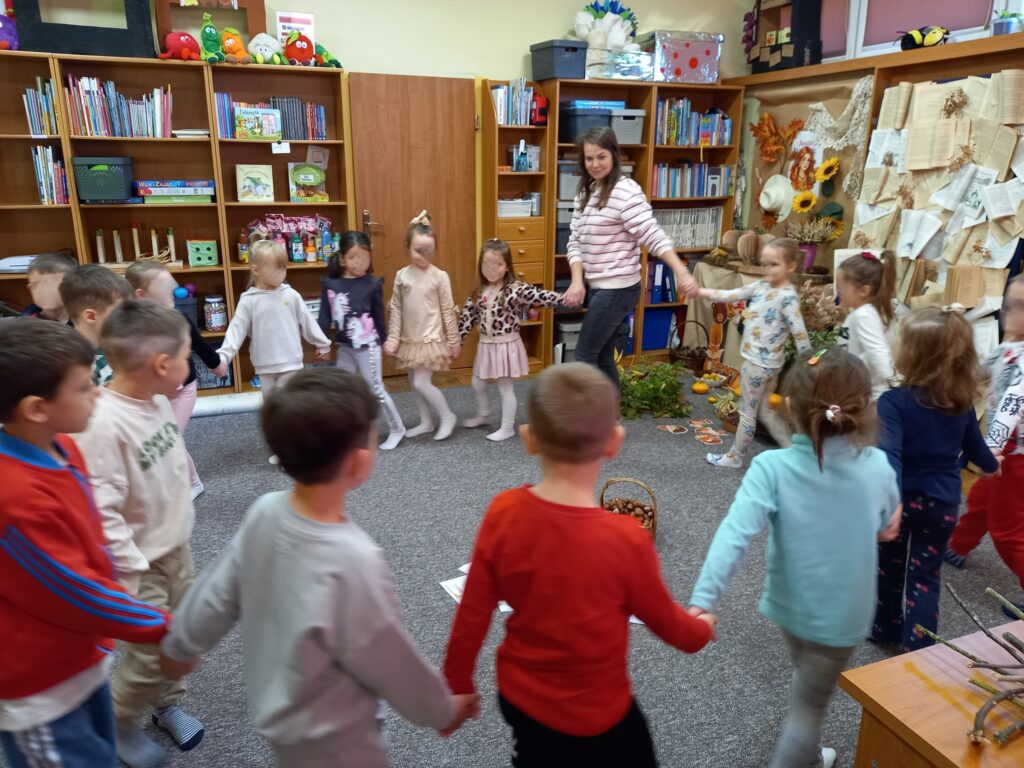 W dalszej części zajęć mali odkrywcy poznawali dary jesieni. Ich zadaniem było odnalezienie ośmiu kopert ukrytych w czytelni i wykonanie zadań przypisanych do każdej z nich. Po pomyślnym rozwiązaniu wszystkich zadań dzieci dowiedziały się, co pani Jesień ukryła w swoim koszu.