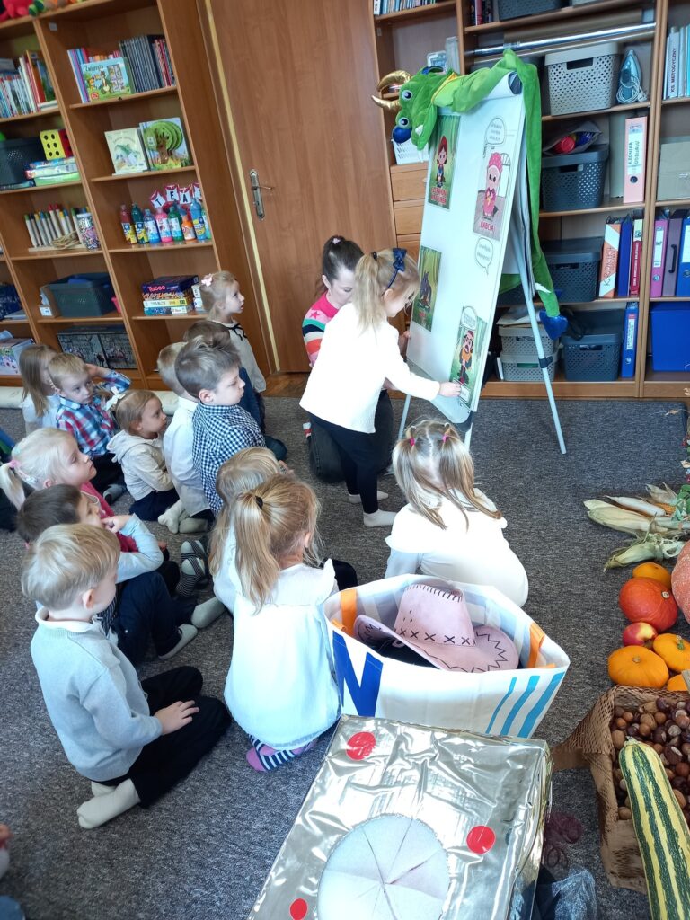Zabawy przygotowane dla maluchów przeniosły je w prawdziwie bajkowy świat. Rozwiązywały zagadki, dopasowywały fragmenty tekstów do znanych postaci oraz próbowały rozpoznać bajki po krótkich opisach. Ogromnym przeżyciem okazało się zadanie inspirowane pracą Kopciuszka — dzieci musiały oddzielić groch od fasoli. Poradziły sobie z tym z wielkim zaangażowaniem! ![]()