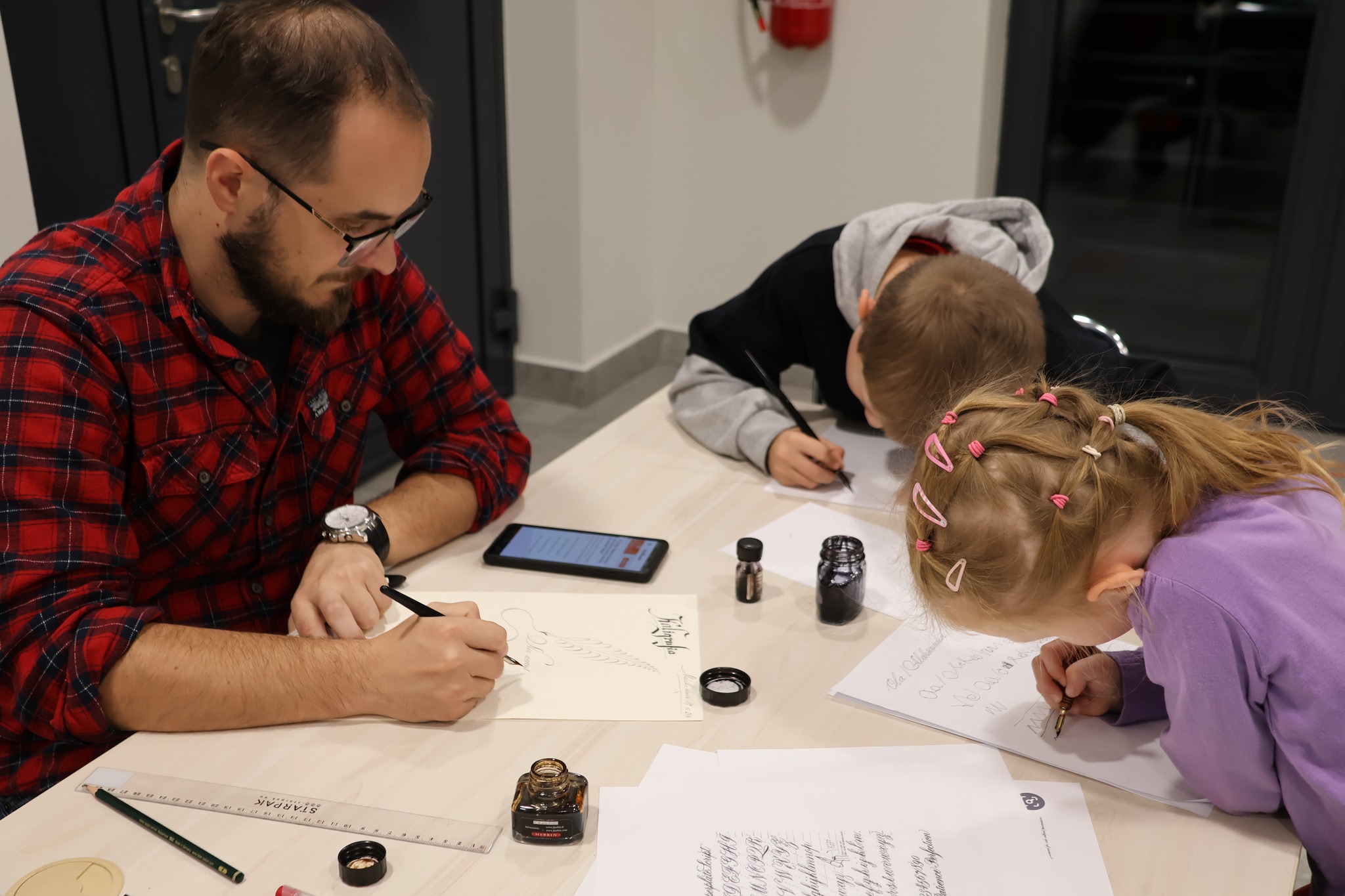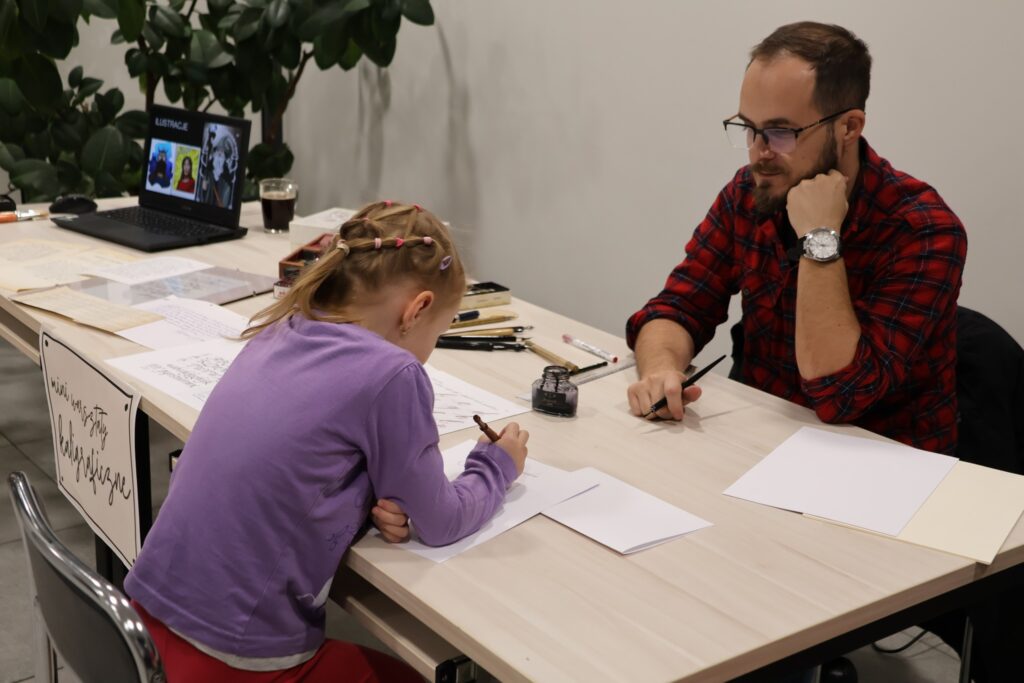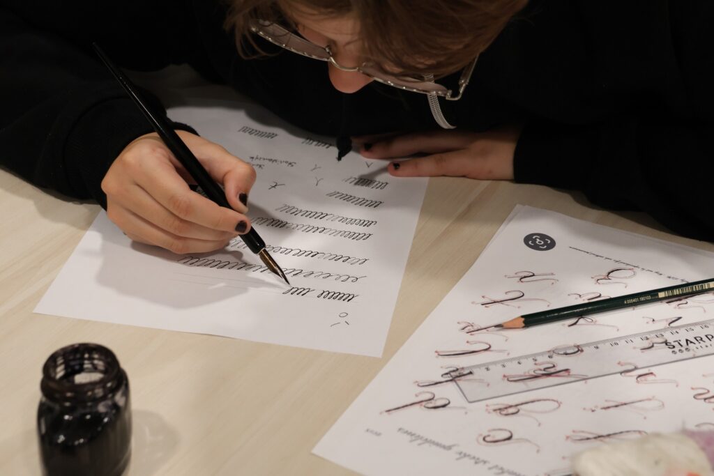 skupienie podczas warsztatów kaligrafii,