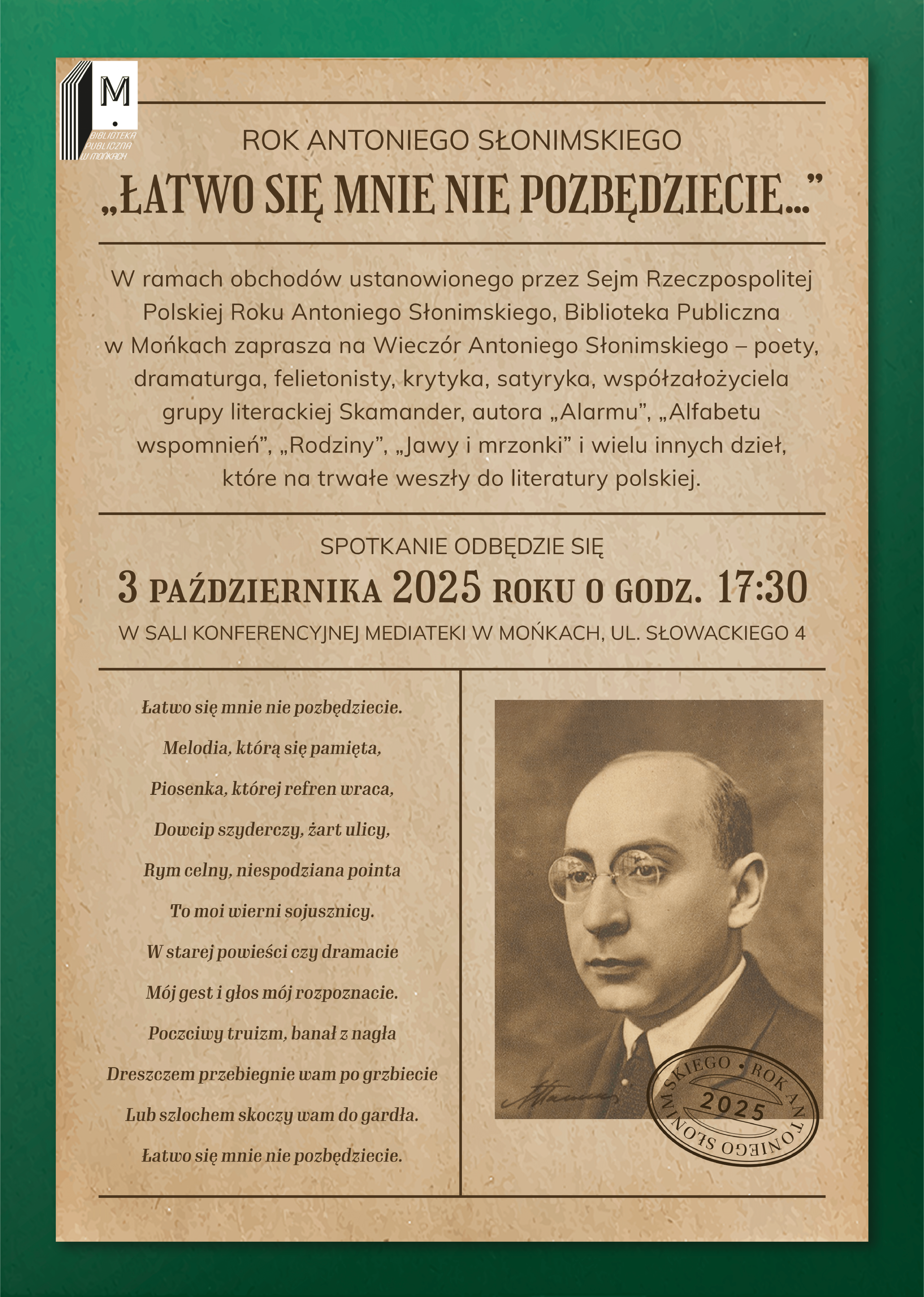 W ramach obchodów Roku Antoniego Słonimskiego - poety, satyryka, publicysty - serdecznie zapraszamy na wyjątkowy wieczór literacki pt. „Łatwo się mnie nie pozbędziecie”! Wydarzenie uświetnią