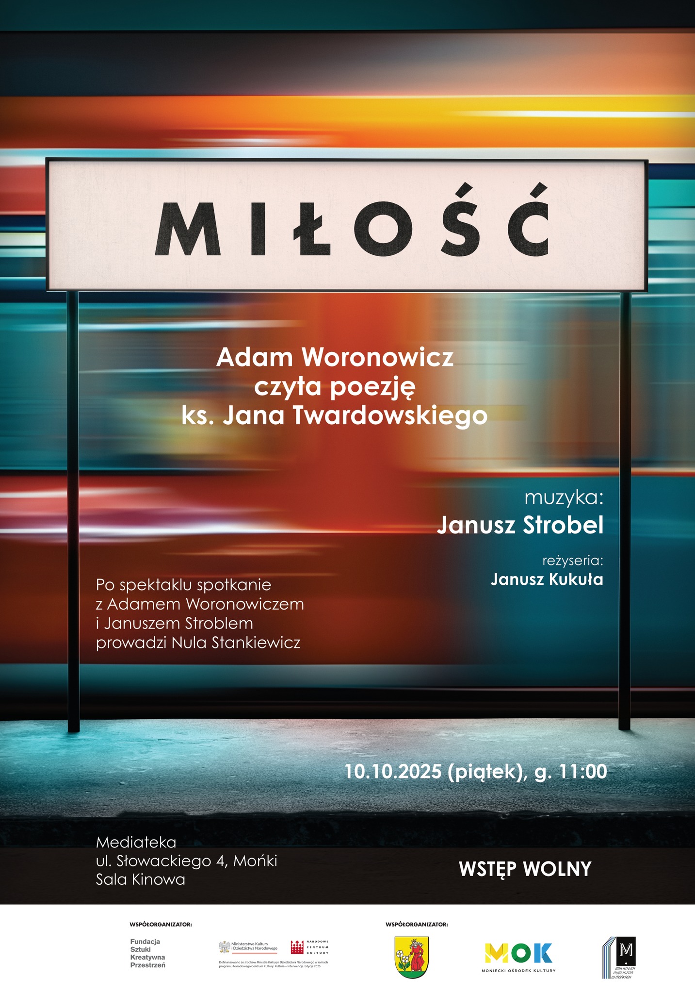 Burmistrz Moniek Zbigniew Karwowski, Moniecki Ośrodek Kultury oraz Biblioteka Publiczna w Mońkach zapraszają na spektakl ,,Miłość - Adam Woronowicz czyta poezję ks. Jana Twardowskiego''! „MIŁOŚĆ"