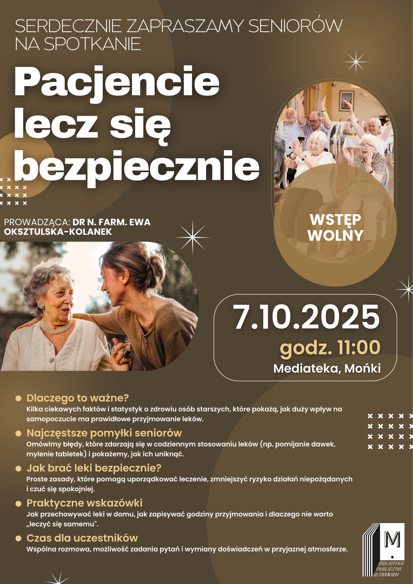 Serdecznie zapraszamy seniorów na spotkanie ,,Pacjencie lecz się bezpiecznie""! Podczas spotkania poruszone będą następujące tematy: Dlaczego to ważne? – kilka ciekawych faktów i statystyk o