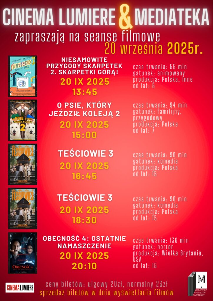 Mediateka i Cinema Lumiere Prezentuje zapraszają na biletowane seanse filmowe w MEDIATECE, które odbędą się 20 września 2025 (sobota)